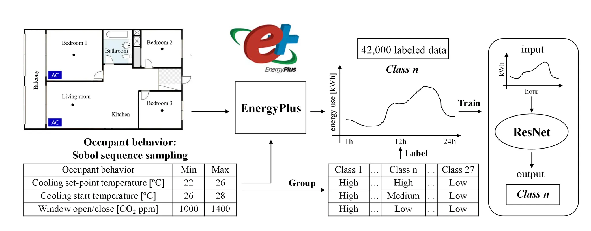 Because occupant behavior (OB) is one of major sources of the performance gap between simulated and actual building energy use, many studies have focused on developing data-driven OB models. However, developing accurate OB models demands large amount of detailed data containing occupant information. Unfortunately, collecting such occupant data is difficult due to privacy and sensor installation. This study aims to present an inverse approach to estimate OB from measured end-use energy data, or hourly aggregated electricity consumption data of a household. For this purpose, occupant behavior patterns (cooling set-point, cooling start temperature, window open/close) were propagated (27 classes, 42,000 samples) and EnergyPlus, one of the most sophisticated dynamic simulation tools were employed. The developed residual neural network (ResNet) model is successful (accuracy level = 86.3%) for identifying the aforementioned occupant behavior patterns.
