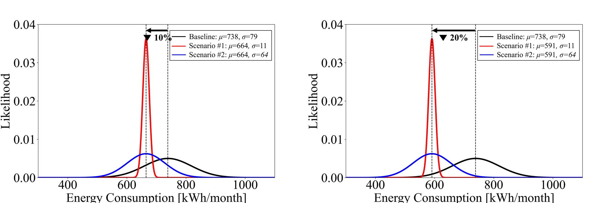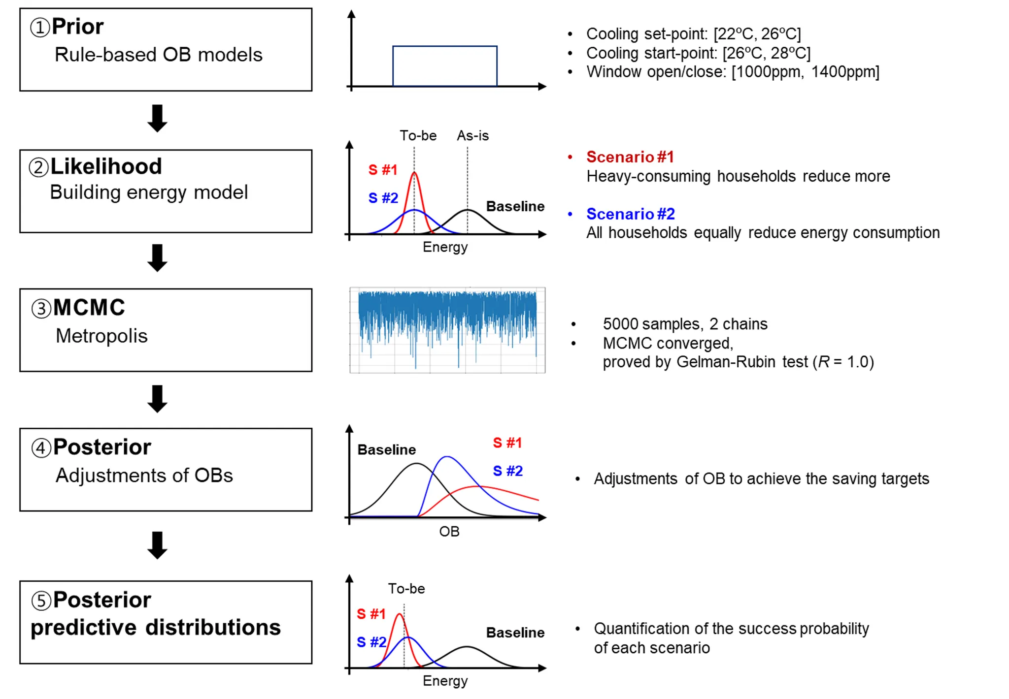 The result shows that the 20% savings target could be achieved by adjusting cooling set point temperatures for Scenario #1 and adjusting all three occupant behaviors for Scenario #2, as indicated by the posterior distributions.