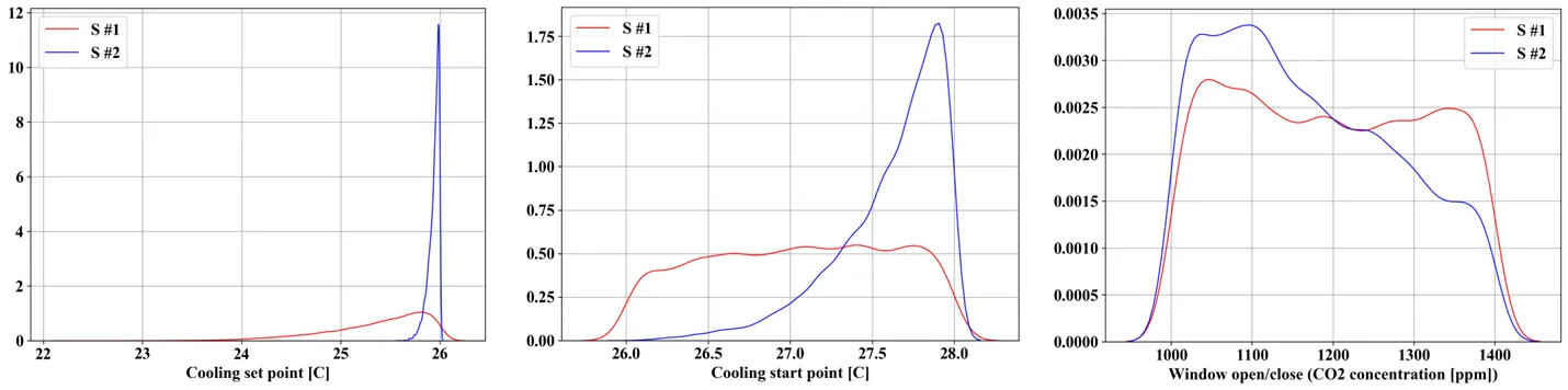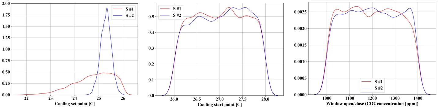 The posterior distributions of the other two occupant behaviors (cooling start point temperature and window open/close) are multimodal. This might be because these behaviors are relatively insensitive and/or correlated to the other involved behaviors, making it difficult to identify an adjusting direction.
