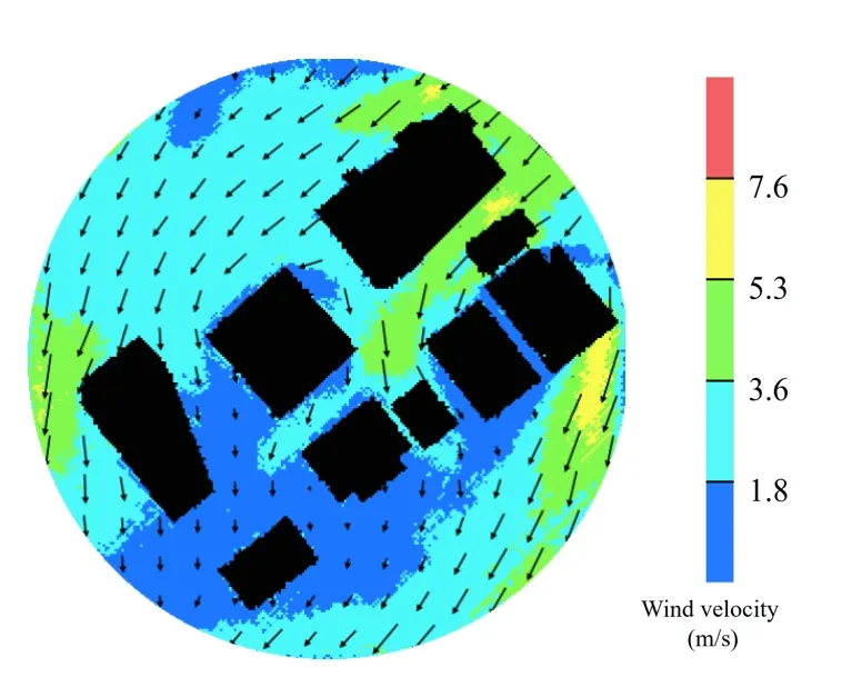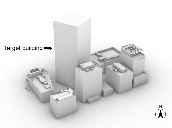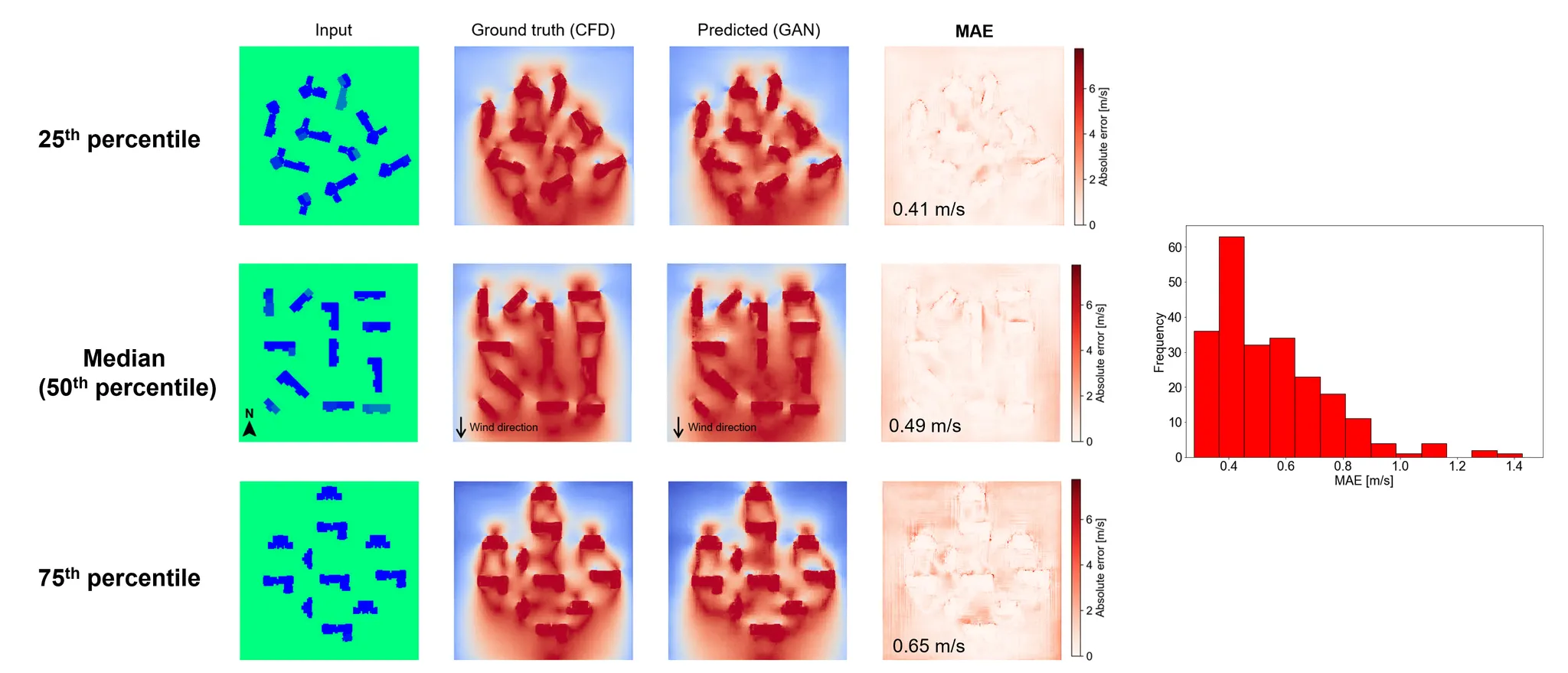 The input image (pixel size: 256×256×1) represents a height map of buildings on the site area of 256m × 256m and the output image (pixel size: 256×256×3) represents a wind vector field.